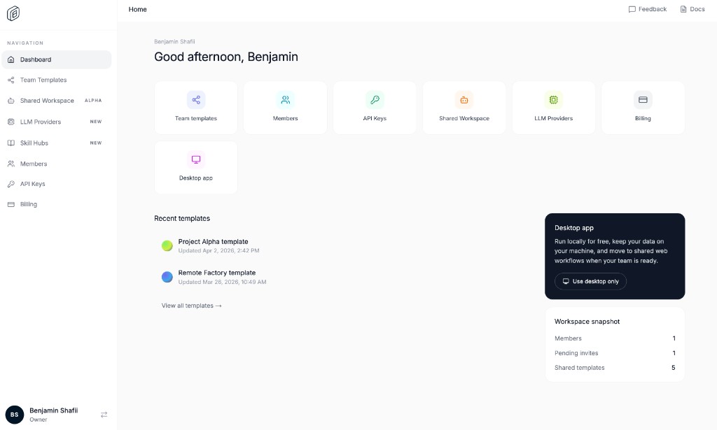 Get your entire organisation running on shared skills, plugins, and AI workflows. Bring your own LLM providers, choose from 50+ supported models, and integrate with LiteLLM out of the box.